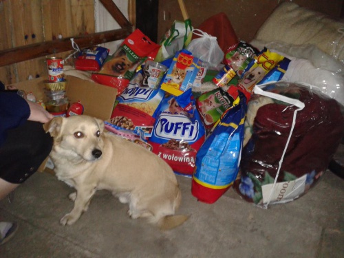 5 dużych ręczników, 5 kołder, 2 poduszki, 3 koce, 1 narzutę, 1 chodnik, 2 miski, 3 smycze, 3 piłeczki, 53,70 kg karmy dla psów, 22,30 kg karmy dla kotów, 3 kg ryżu, 1,5 kg kaszy.