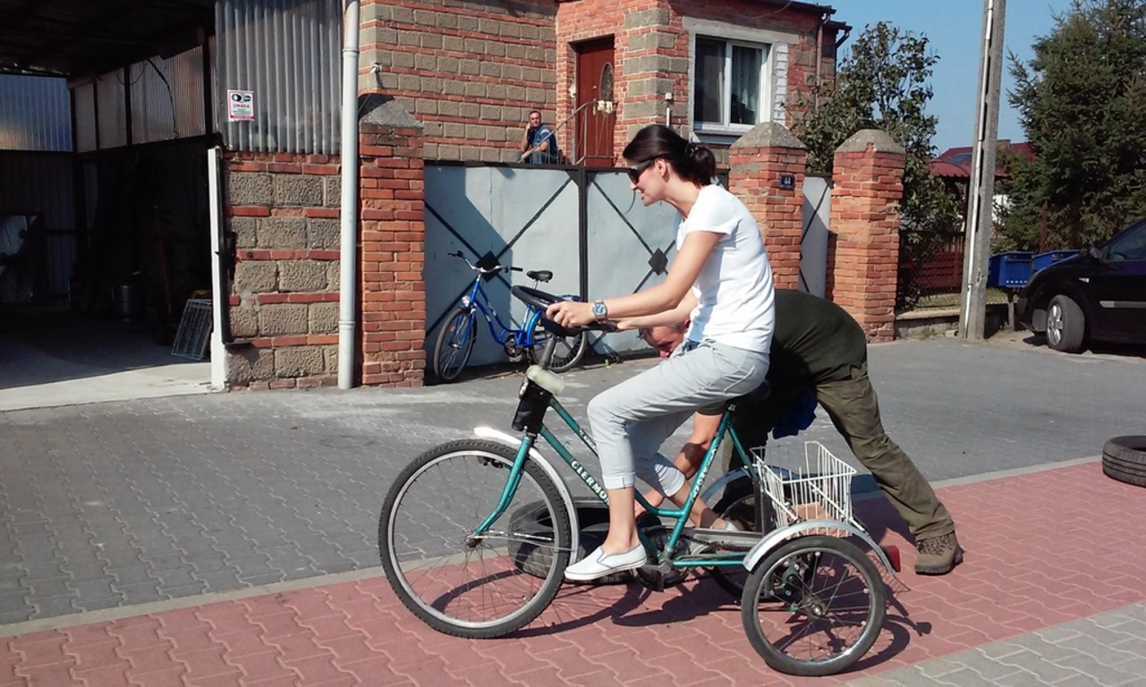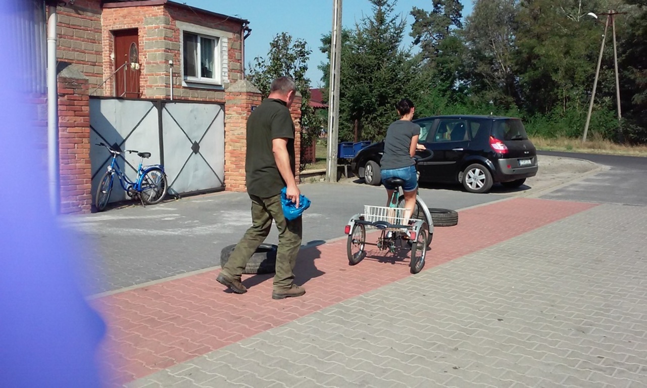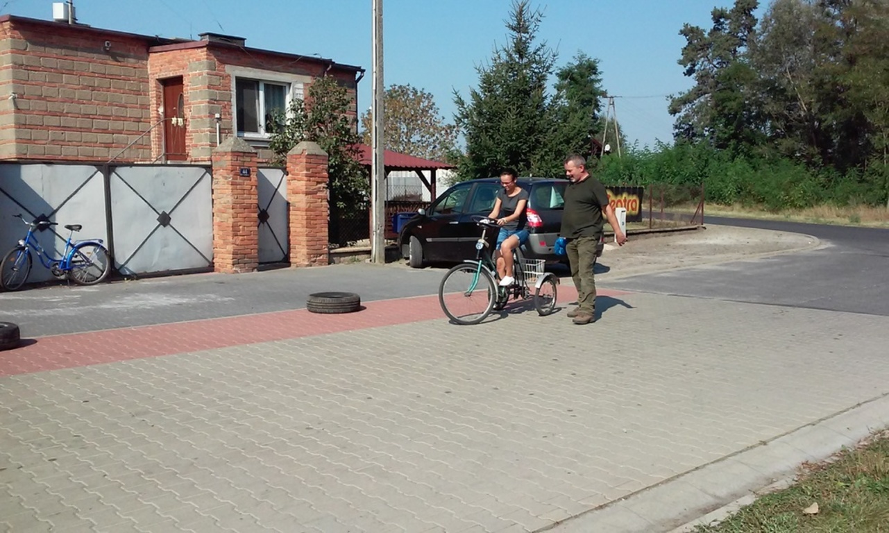 Pogoda dopisała, a na trasie (oprócz ciężkiej pracy) na uczestników akcji czekała niespodzianka przygotowana przez Pana leśniczego - slalom rowerem, który jeździ zupełnie na opak! Kiedy pedałujemy do przodu, maszyna jedzie do tyłu, a kiedy skręcamy z prawo, rower zmierza w lewo. Była to atrakcja, w której wzięły udział nauczycielki, ale kibicowanie im sprawiło uczniom równie dużą frajdę.