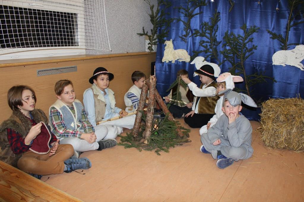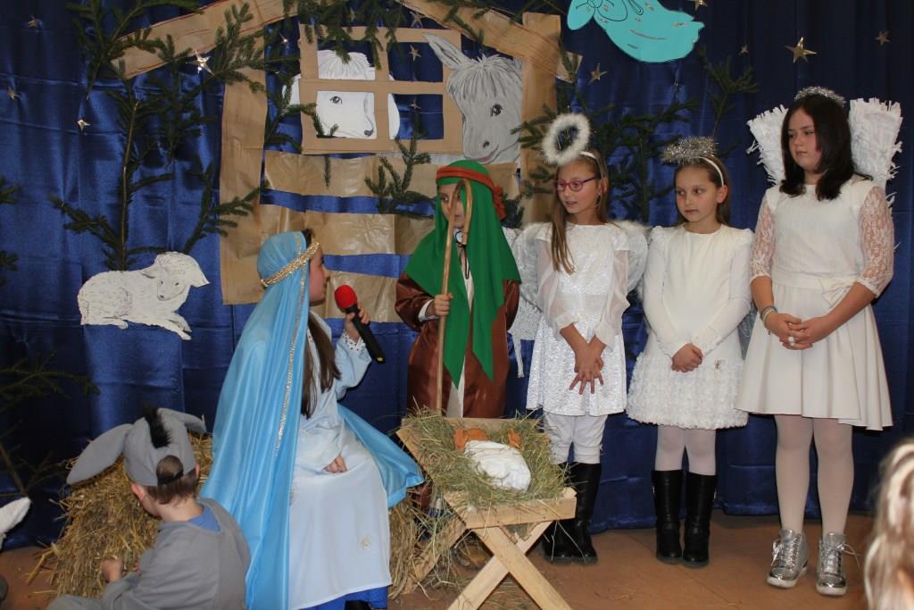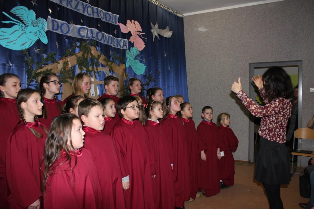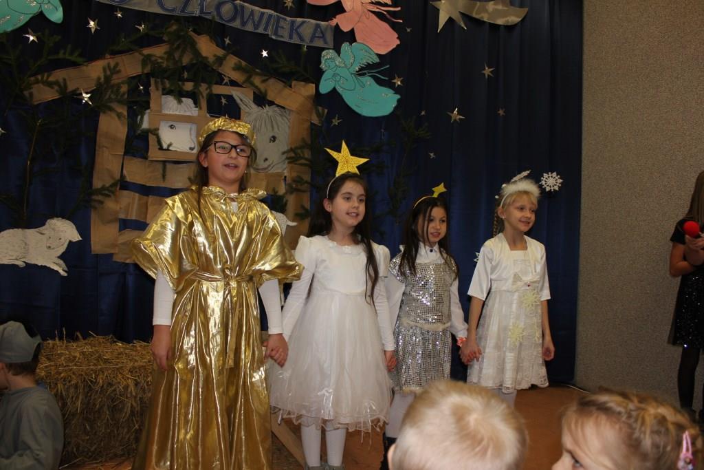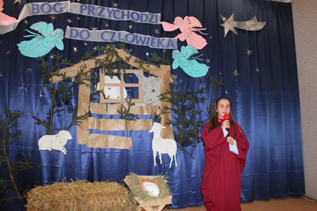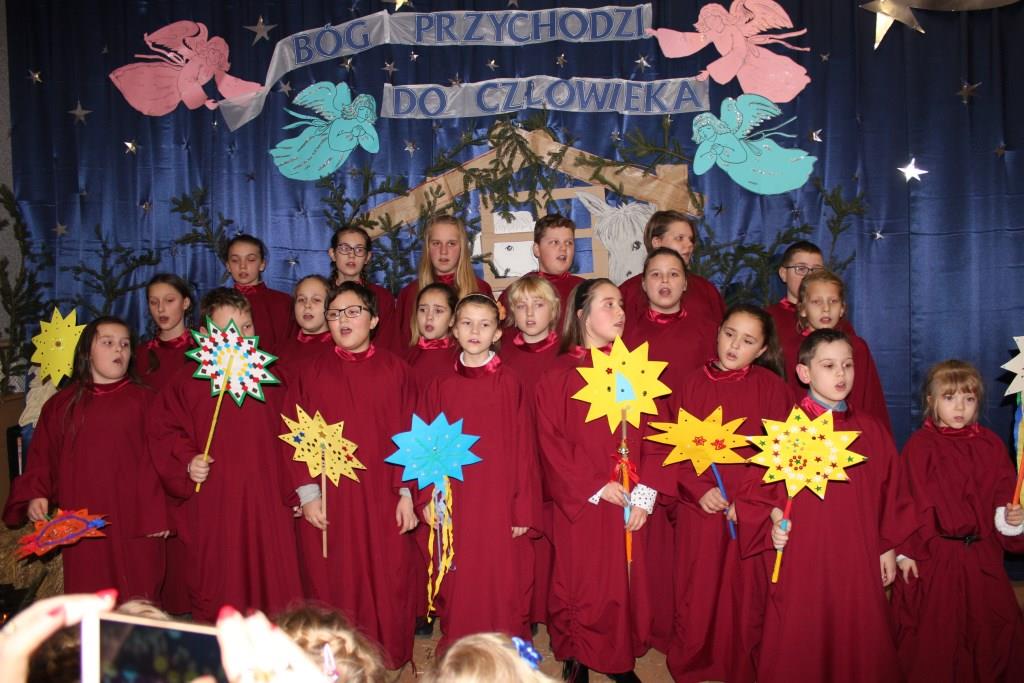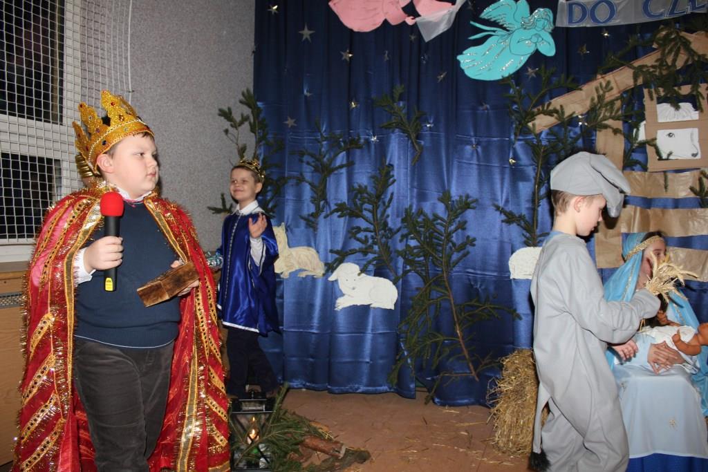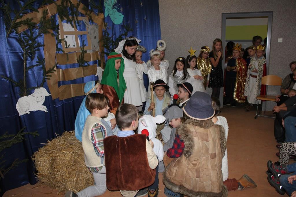 W przedstawieniu wzięli udział głownie uczniowie młodszych klas. Obok Maryi i Józefa nie zabrakło Trzech Króli, pasterzy, aniołków i gwiazdeczek, a także przeuroczej pary – owieczki i osiołka. Ponadto podczas wigilii środowiskowej zaprezentowała się zwyciężczyni konkursu śpiewania kolęd – Zuzanna Armata. Swoim śpiewem czas umilił także chór szkolny „Bel canto” pod dyrekcją pani Lidii Ratajczyk. Chórzyści wystąpili z obszernym repertuarem. Wykonali zarówno mniej znane kolędy, jak i popularne piosenki świąteczne, m.in. „Jest taki dzień”.