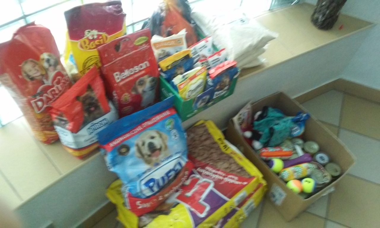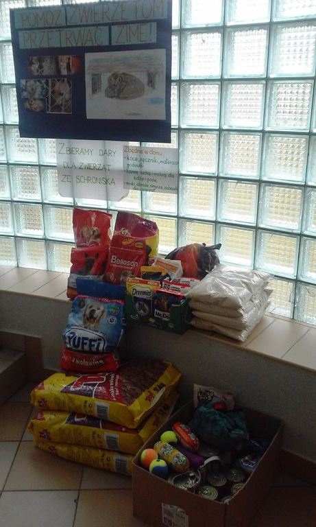 Przedstwiciele szkoły zawieźli zebrane przez wszystkich uczniów podarunki, m.in.: karmę suchą i mokrą oraz smycze i zabawki. Dzieci obejrzały całe schronisko, zapoznały się z milusińskimi w kojcach i na wybiegach, a z często smutną historią wielu zwierząt zapoznała uczniów jedna z pracownic, p. Dorota. Pani opowiadała także o swojej radości z pracy, która wykonuje, a także naświetliła po krótce, jakie obowiązki mają osoby trudniące się opieką w schronisku.