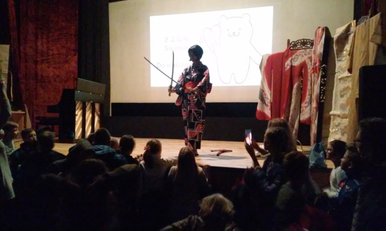 Pierwszym punktem na trasie była sala Gminnego Centrum, gdzie uczniowie przyjrzeli się kulturze japońskiej: językowi, strojom, tradycjom i muzyce. Pani Kayo Nishimizu zaprezentowała także japońską sztukę składania papieru - origami.Uczestnikom spodobała się prezentacja sztuk walki, a najbardziej upodobali sobie sumo. Zebrani wrócili bogatsi o znajomość kilku japońskich słowek, jak: dzień dobry, do widzenia, dziękuję i przepraszam.