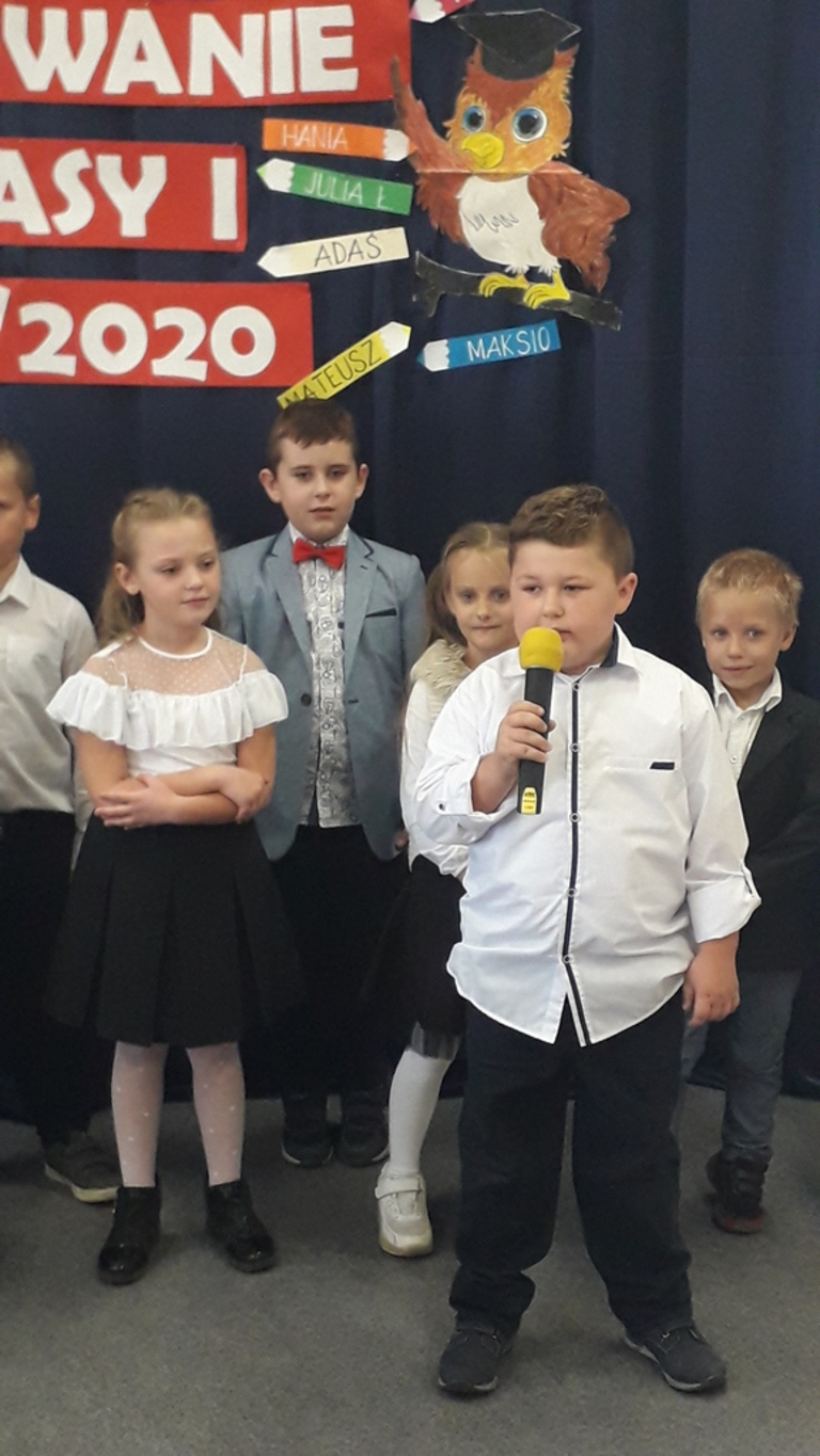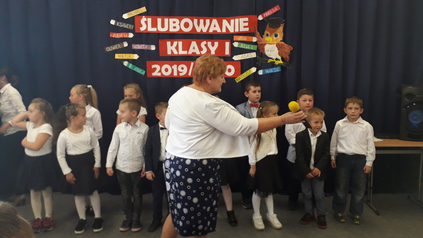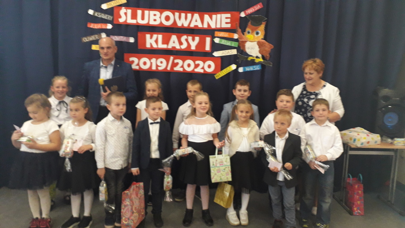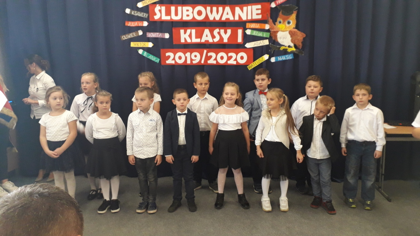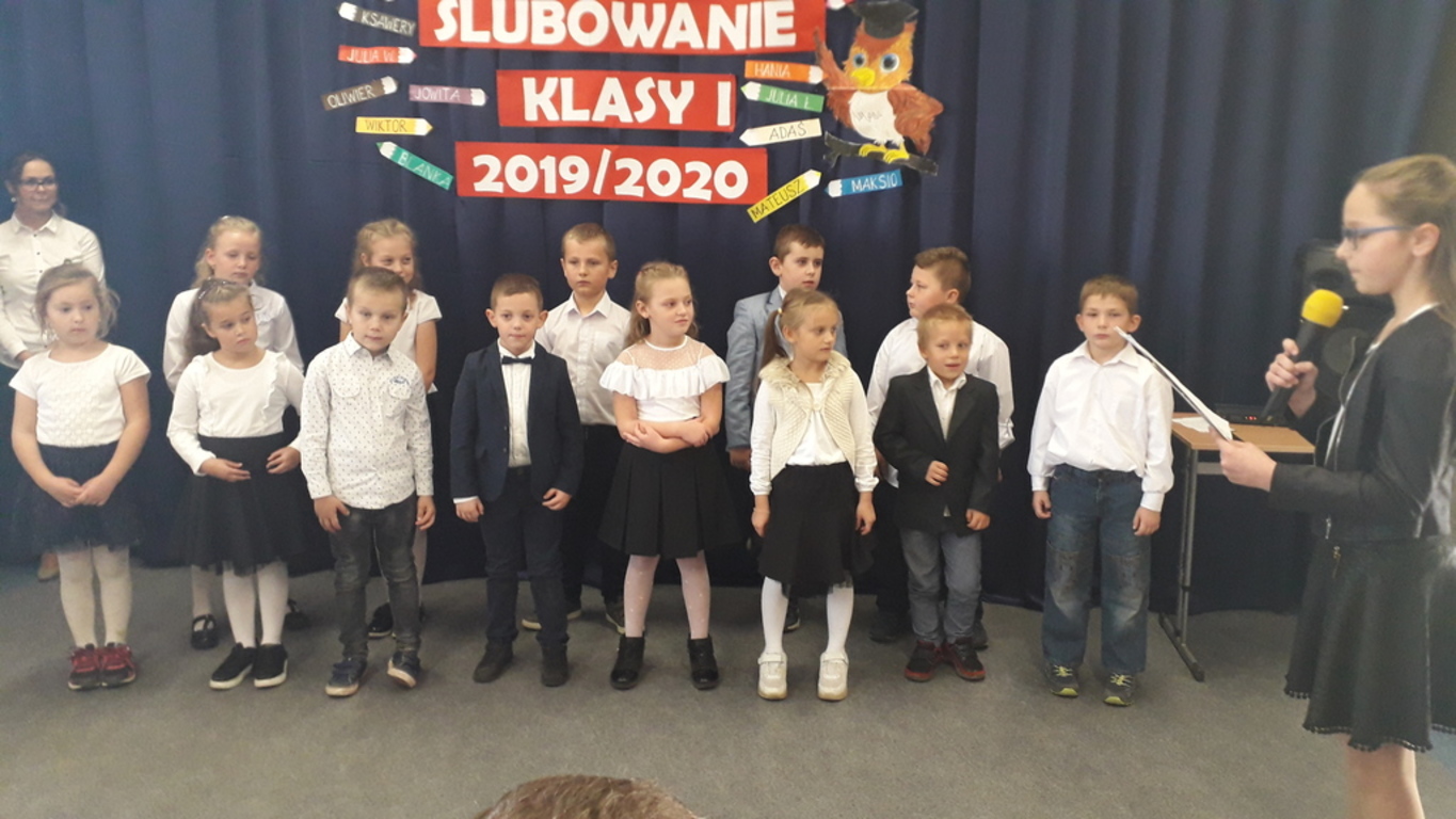 Dyrektor Szkoły Paweł Dudziak powitał zebranych rodziców, nauczycieli i i uczniów. Uczniowie klasy pierwszej i ich dwoje kolegów z piątej b zaprezentowali krótkie przedstawienie. Przygotowywali się do niego wytrwale. Po części artystycznej pierwszacy ślubowali być dobrymi Polakami, wzorowo się zachowywać oraz sumiennie się uczyć. Po złożeniu ślubowania dzieci zostały pasowane na uczniów.