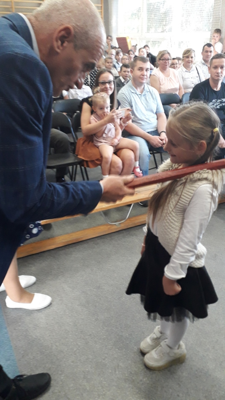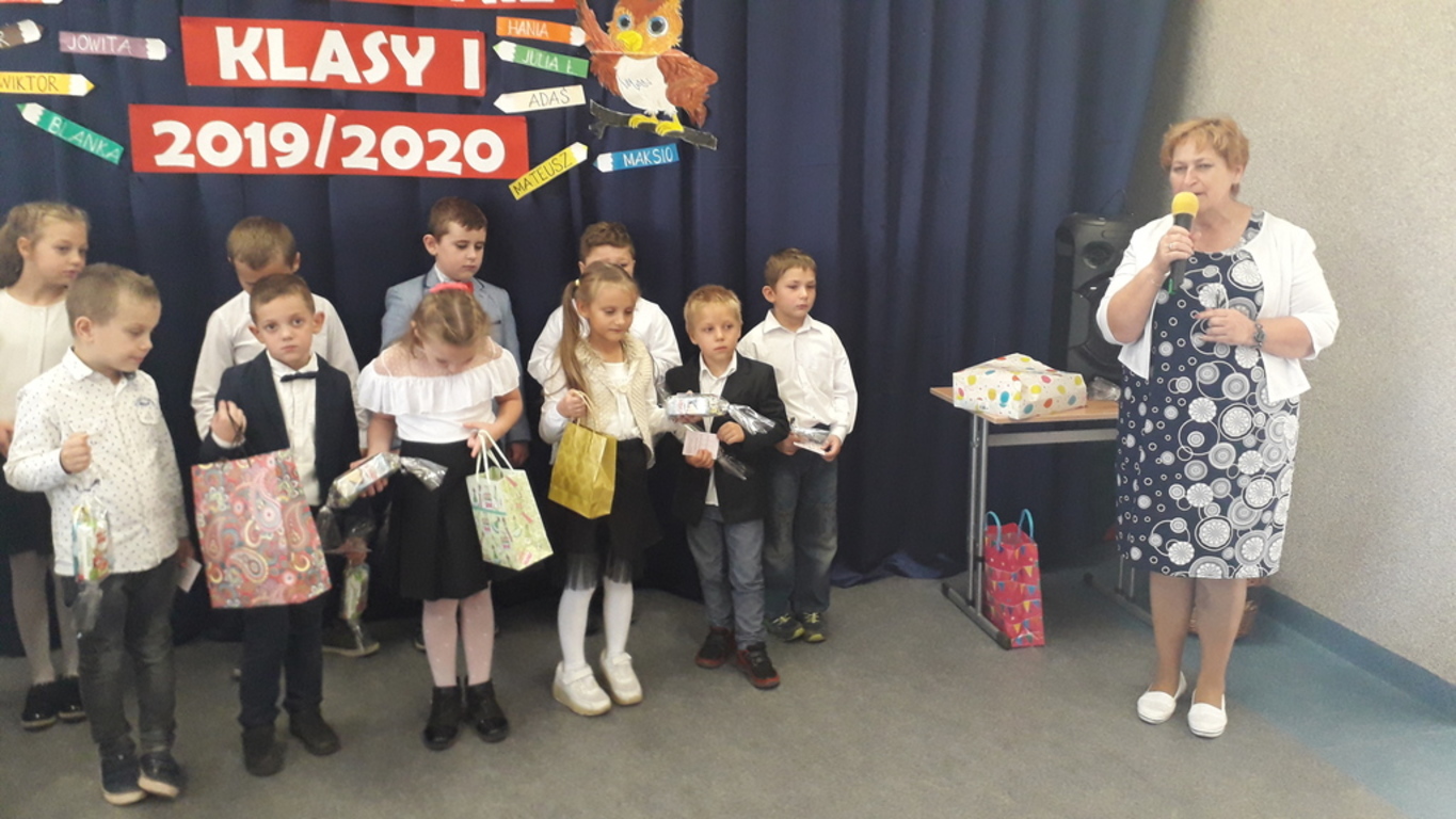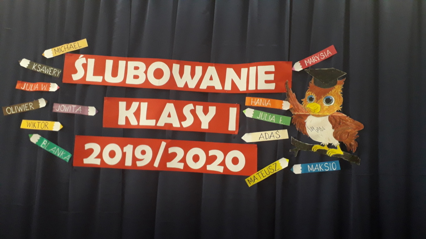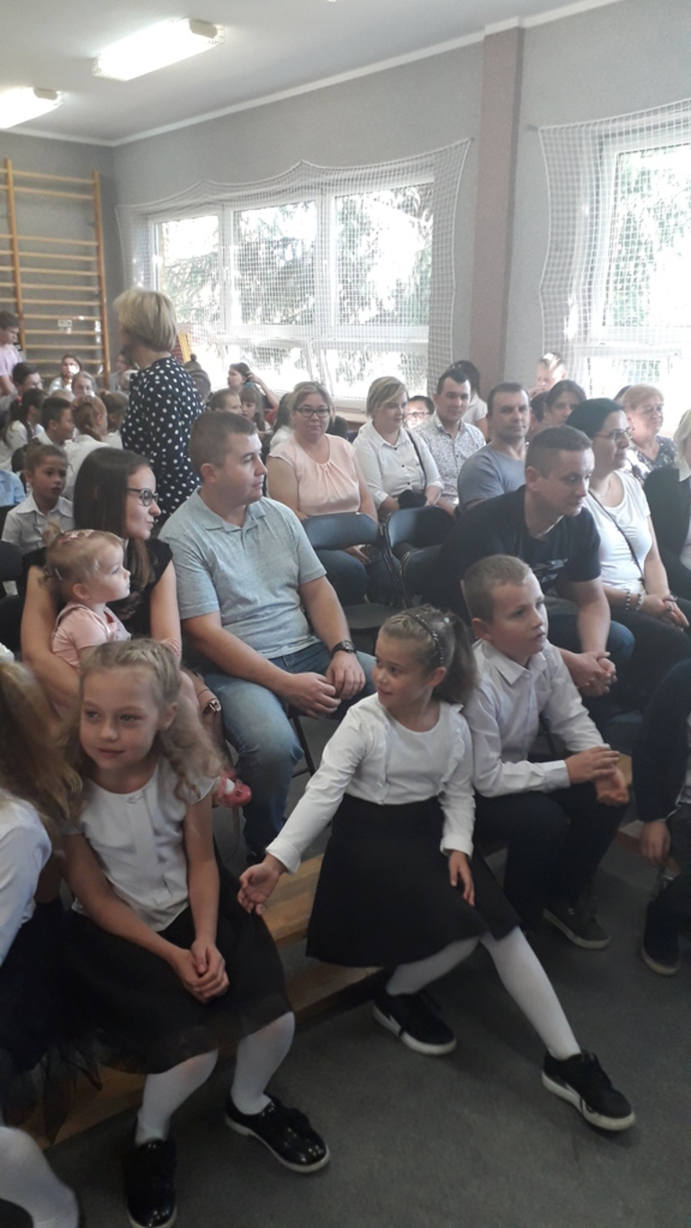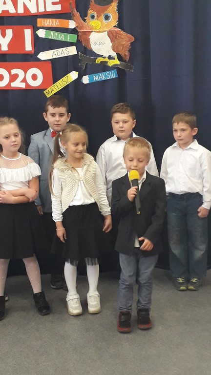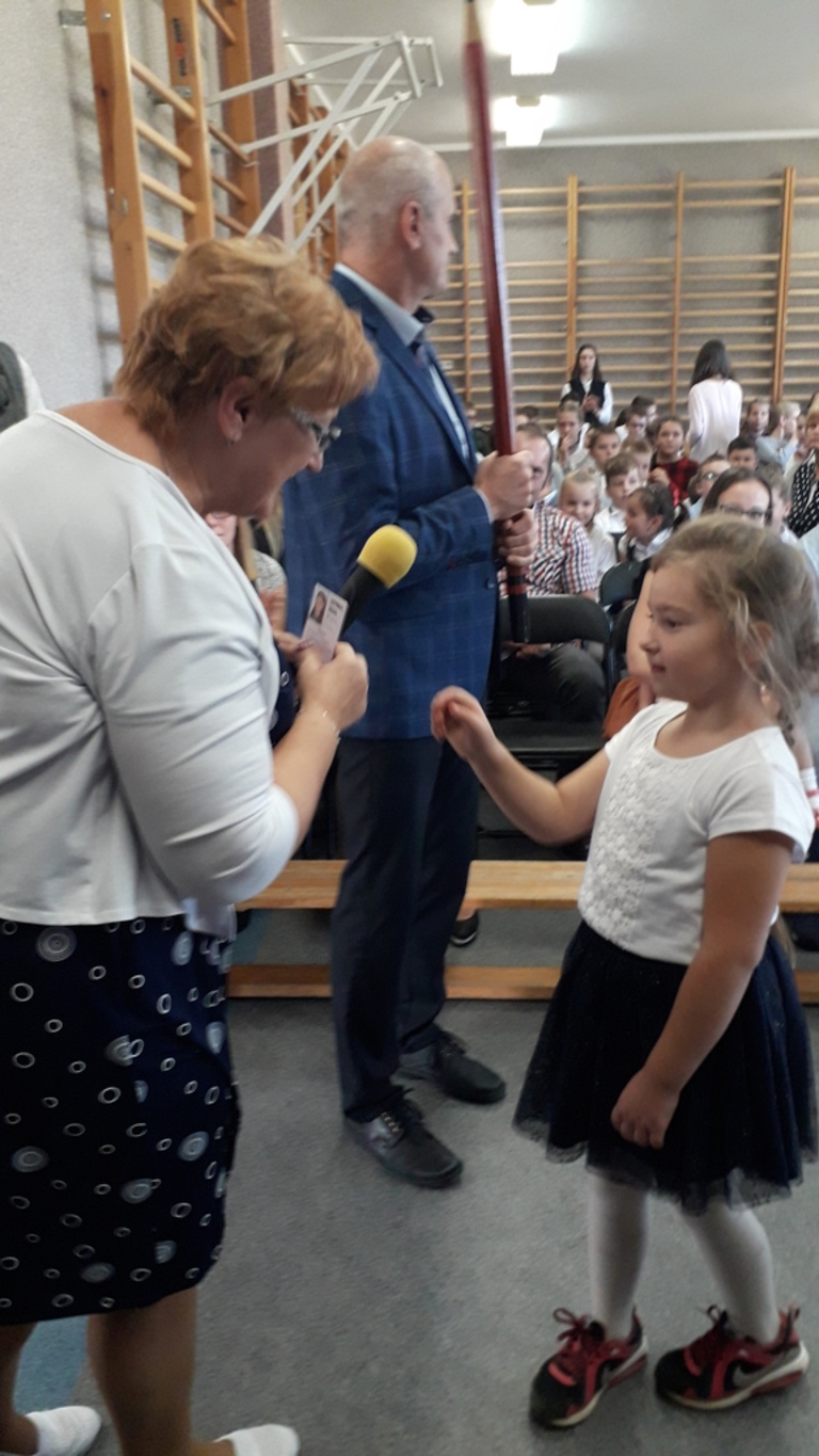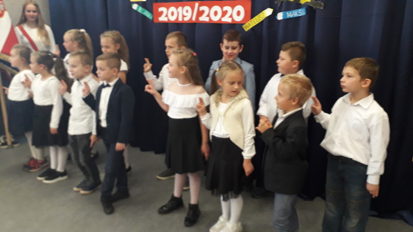 Dyrektor Szkoły Paweł Dudziak powitał zebranych rodziców, nauczycieli i i uczniów. Uczniowie klasy pierwszej i ich dwoje kolegów z piątej b zaprezentowali krótkie przedstawienie. Przygotowywali się do niego wytrwale. Po części artystycznej pierwszacy ślubowali być dobrymi Polakami, wzorowo się zachowywać oraz sumiennie się uczyć. Po złożeniu ślubowania dzieci zostały pasowane na uczniów.