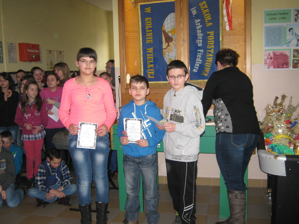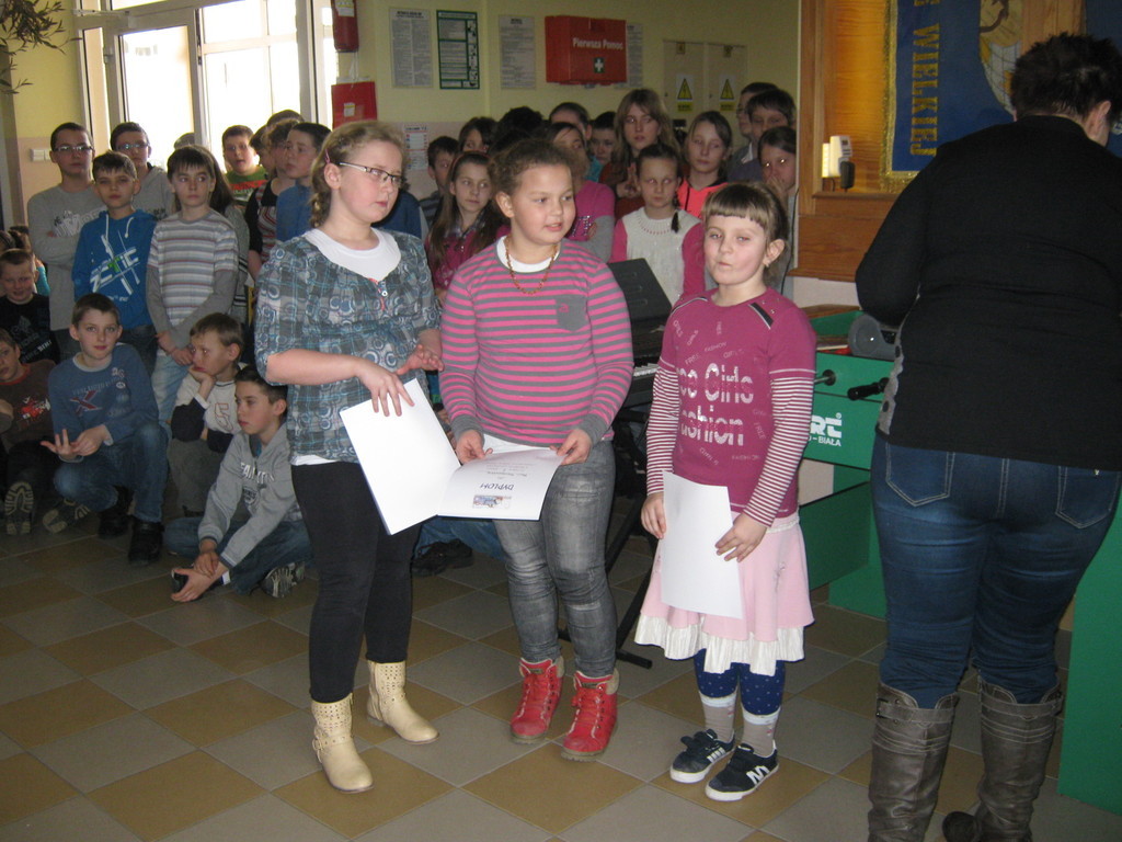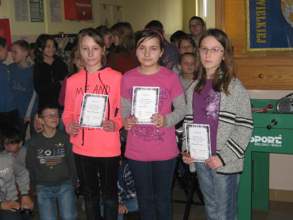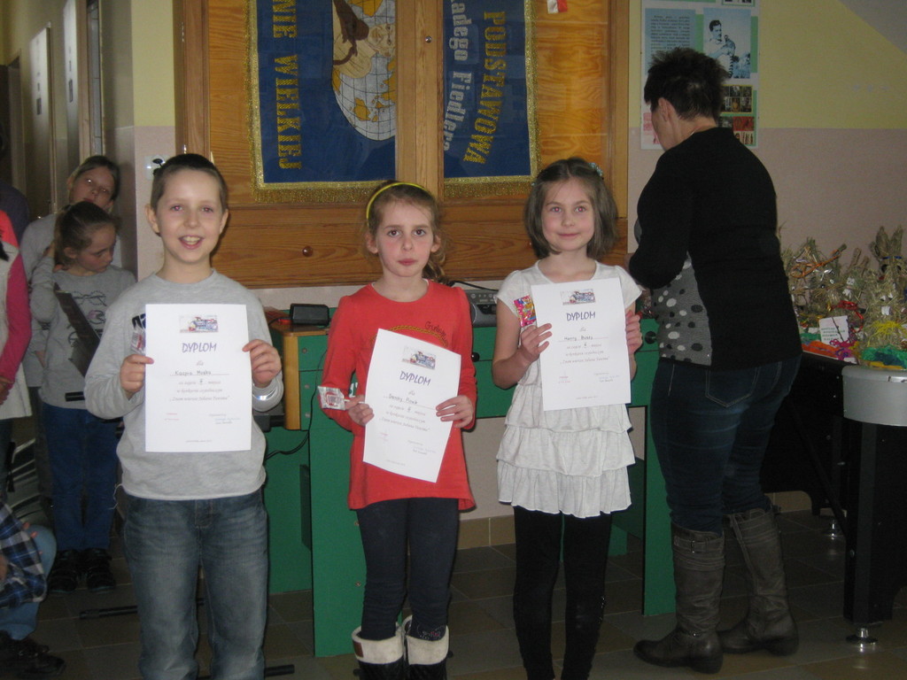 miejsce przypadło w udziale: Hannie Buszy - kl.I, Kacprowi Mośkowi - kl.II oraz Sandrze Piosik - kl.II.