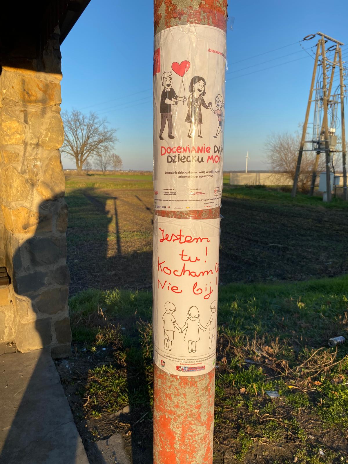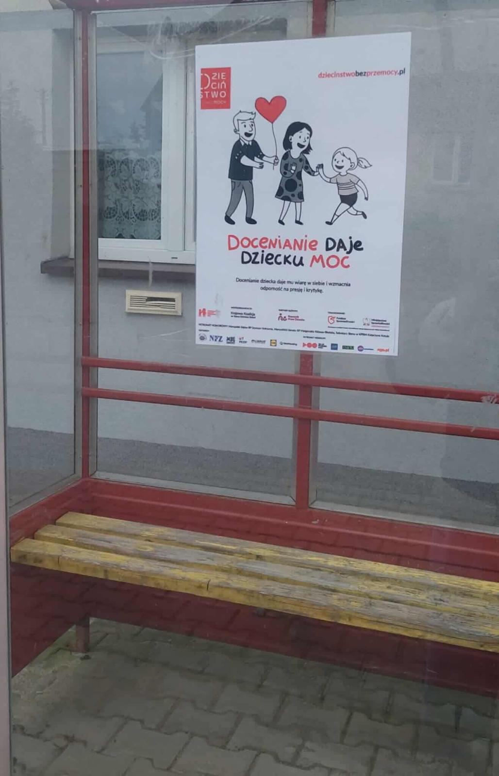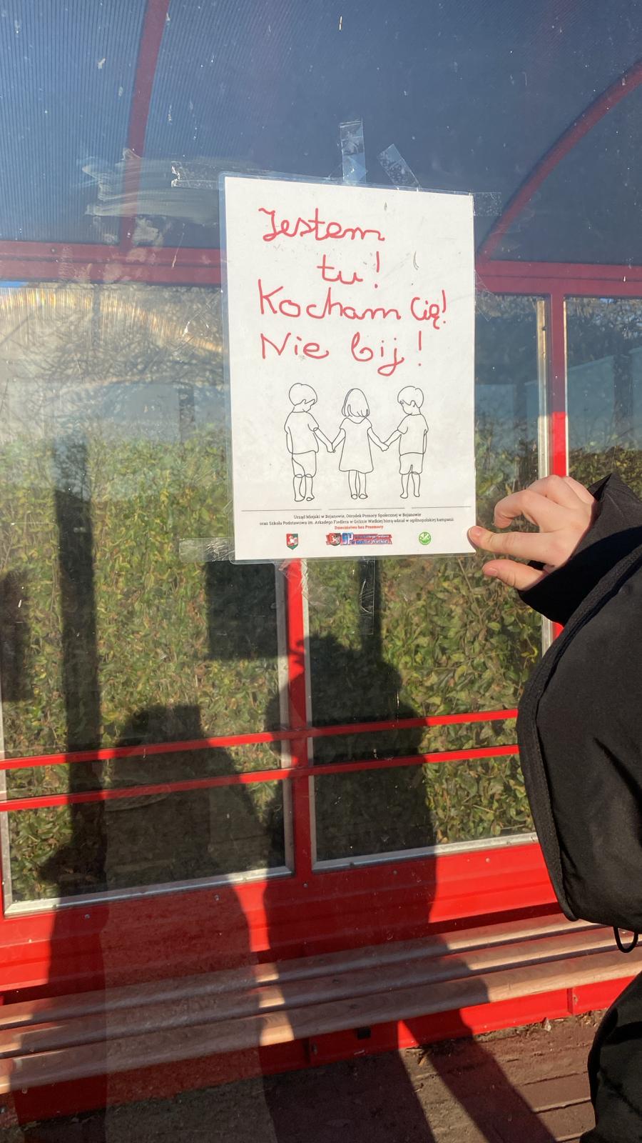 Nasi uczniowie i uczennice rozwiesili plakaty przygotowane specjalnie na kampanię na przystankach autobusowych w gminie, tak by każdy mógł zwrócić na nie uwagę i zainteresować się problemem przemocy, która dotyka wiele polskich domów.
