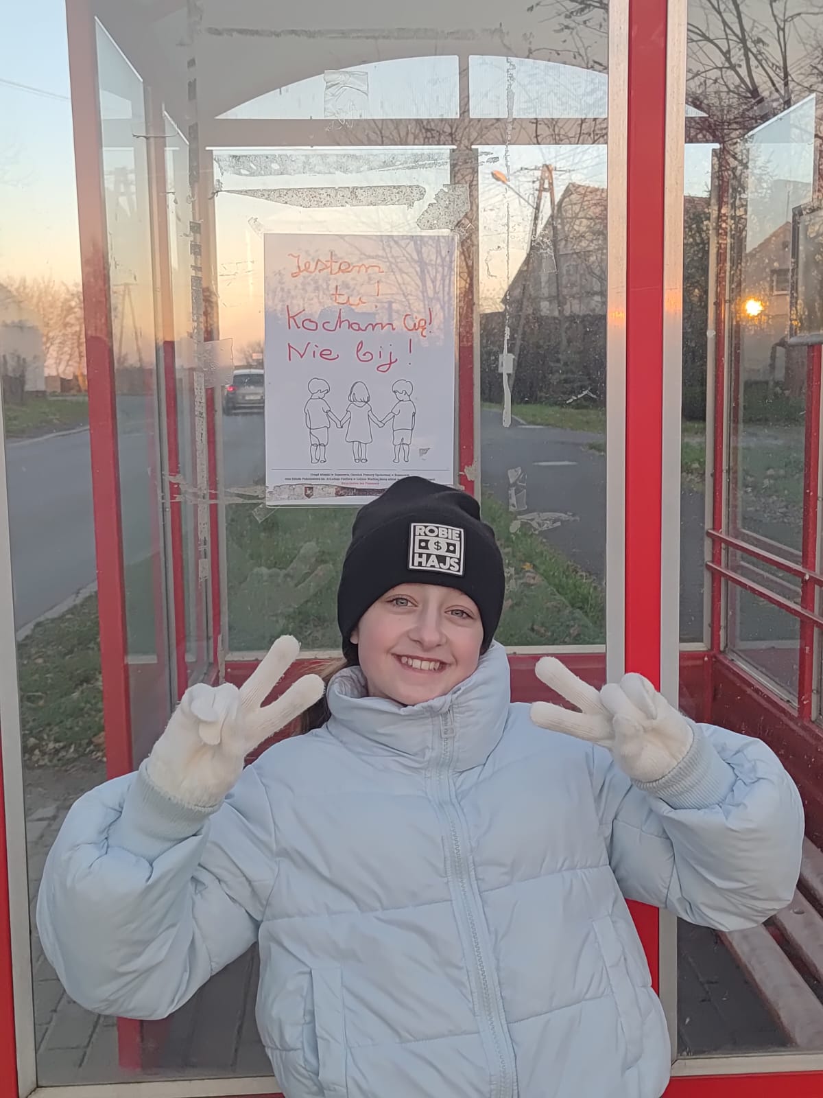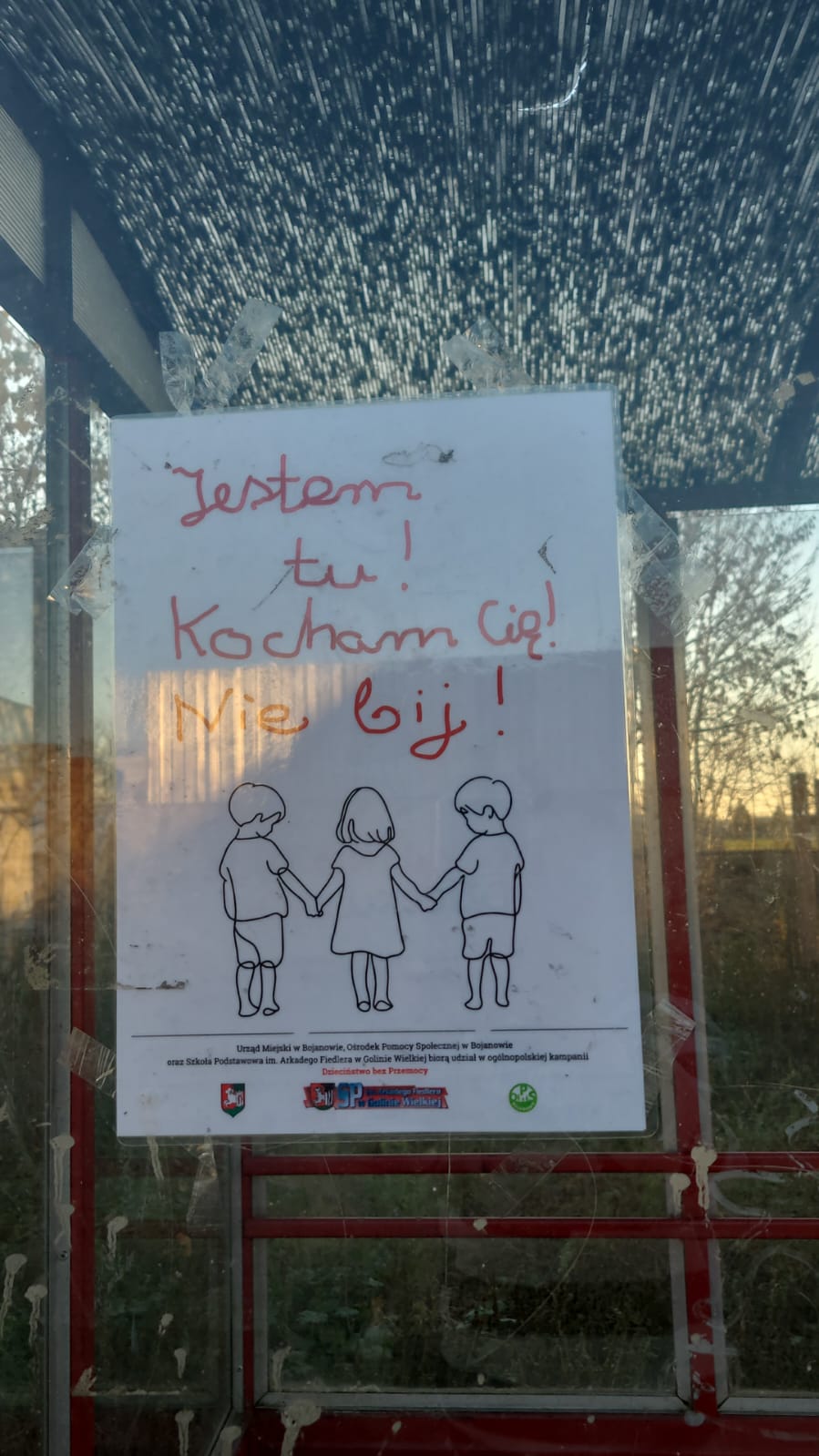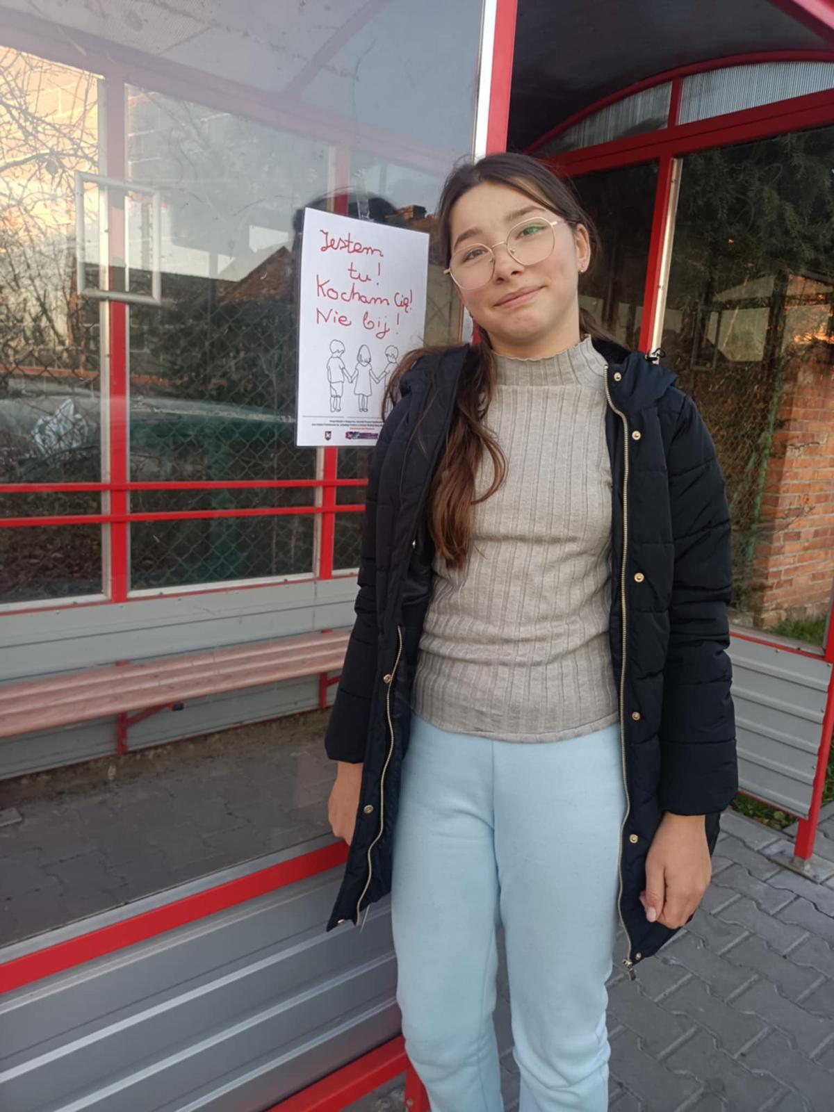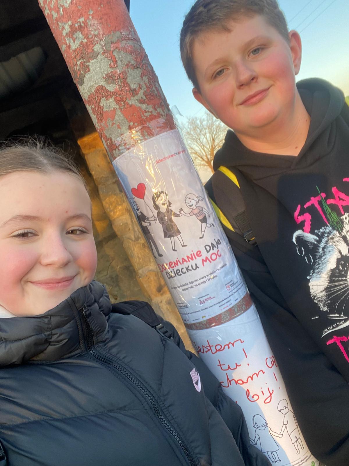 Nasi uczniowie i uczennice rozwiesili plakaty przygotowane specjalnie na kampanię na przystankach autobusowych w gminie, tak by każdy mógł zwrócić na nie uwagę i zainteresować się problemem przemocy, która dotyka wiele polskich domów.