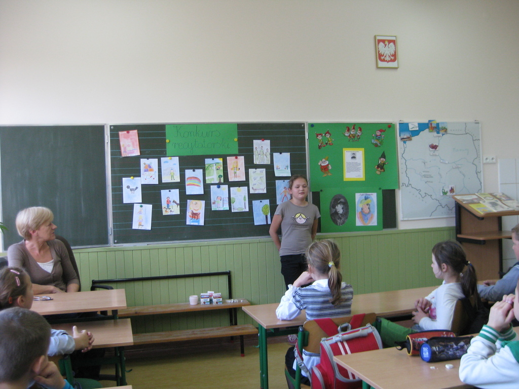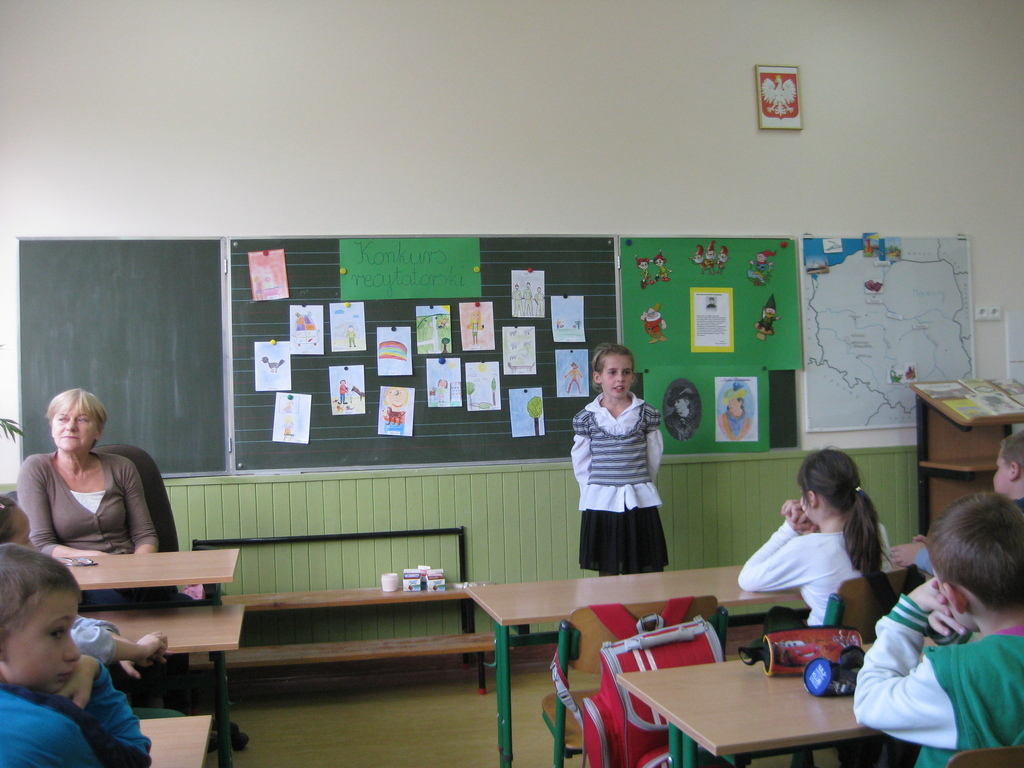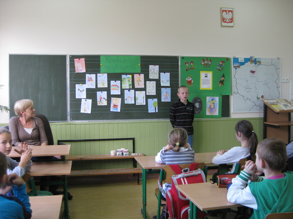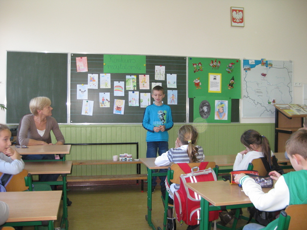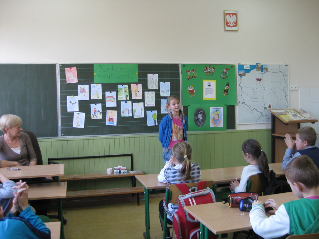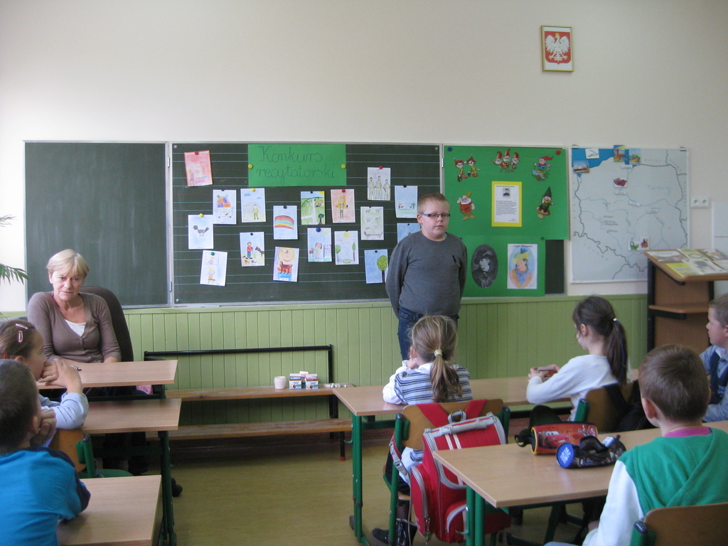 30 października wszyscy uczniowie klasy trzeciej brali udział w szkolnym etapie XIV Powiatowego Konkursu Recytatorskiego Klas III. Organizatorzy konkursu zdecydowali, iż w tym roku uczestnicy wykonywać będą wiersze Marii Konopnickiej. Siedemnaścioro trzecioklasistów prezentowało swe umiejętności recytatorskie przed komisją konkursu w osobach pań: Aleksandry Marczewskiej i Jadwigi Rychlickiej. Kibicowało im też kilkoro przybyłych rodziców. Decyzją jury I miejsce zajęła Katarzyna Fiebig, która recytowała wiersz pt. " Skrucha Józi".
