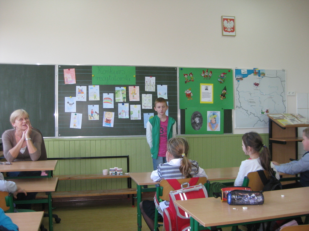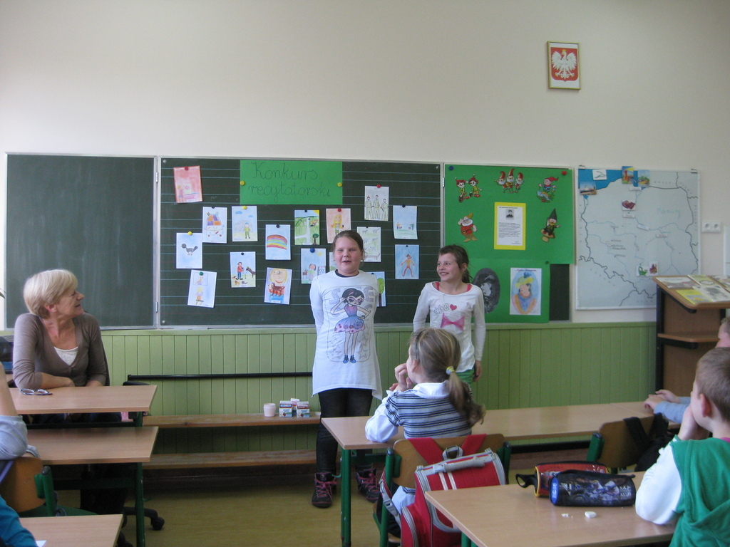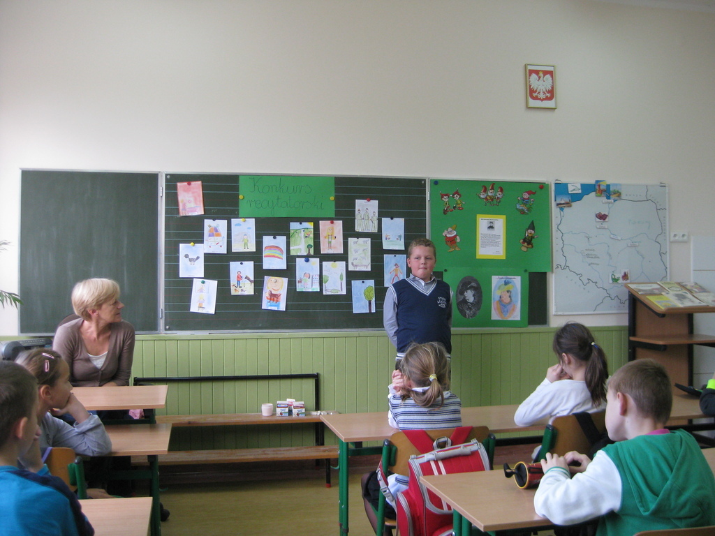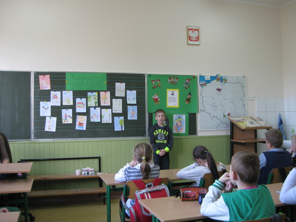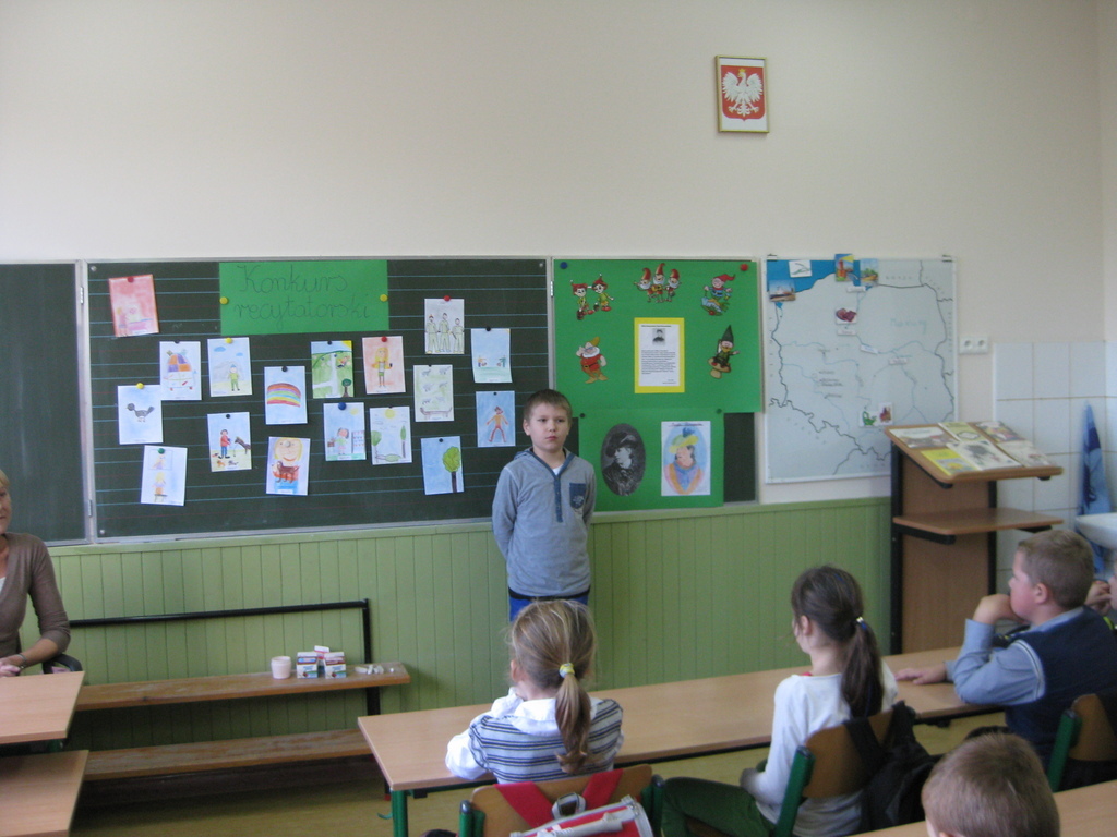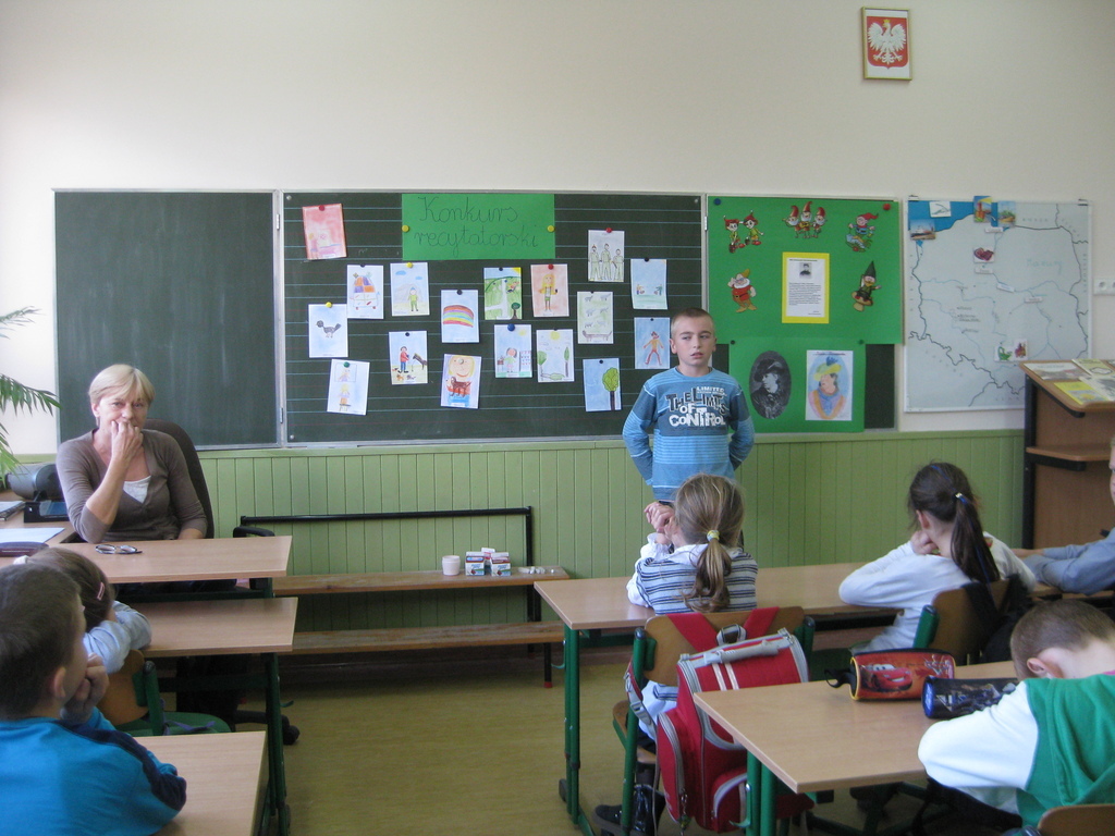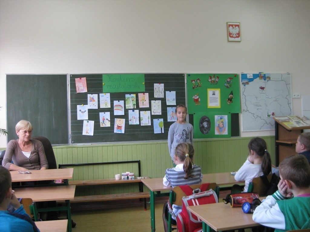 30 października wszyscy uczniowie klasy trzeciej brali udział w szkolnym etapie XIV Powiatowego Konkursu Recytatorskiego Klas III. Organizatorzy konkursu zdecydowali, iż w tym roku uczestnicy wykonywać będą wiersze Marii Konopnickiej. Siedemnaścioro trzecioklasistów prezentowało swe umiejętności recytatorskie przed komisją konkursu w osobach pań: Aleksandry Marczewskiej i Jadwigi Rychlickiej. Kibicowało im też kilkoro przybyłych rodziców. Decyzją jury I miejsce zajęła Katarzyna Fiebig, która recytowała wiersz pt. " Skrucha Józi".