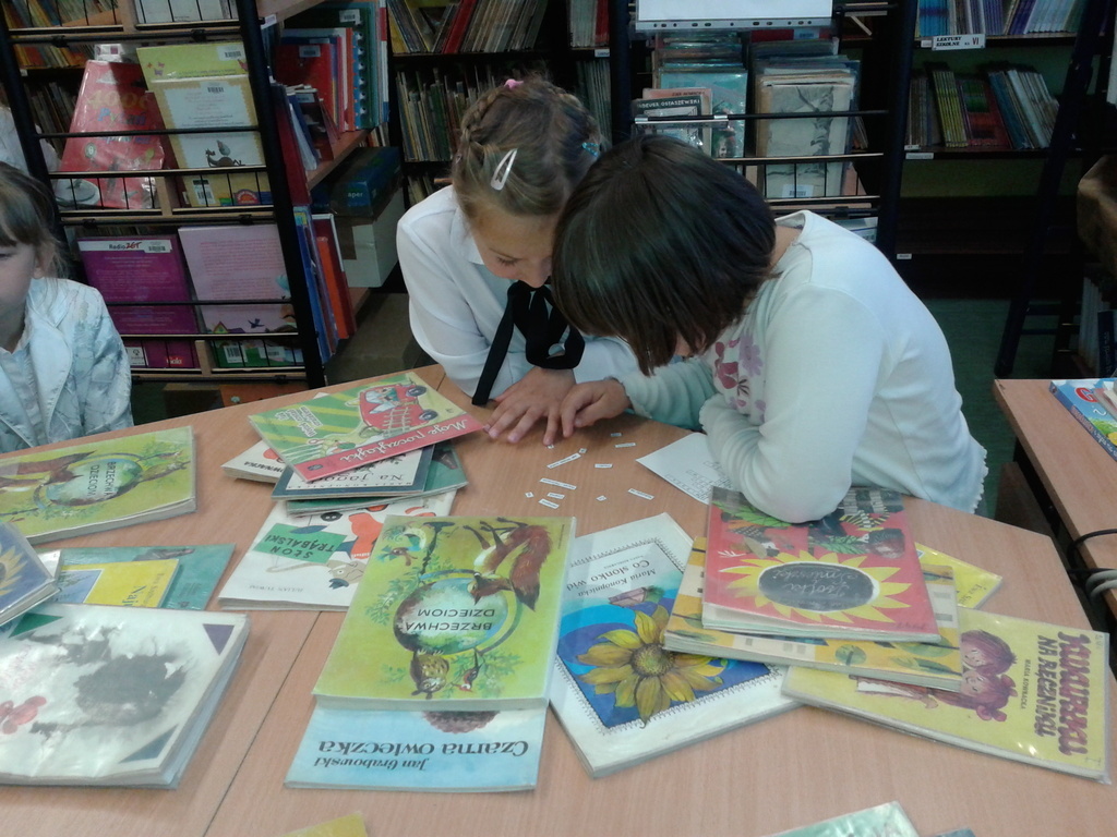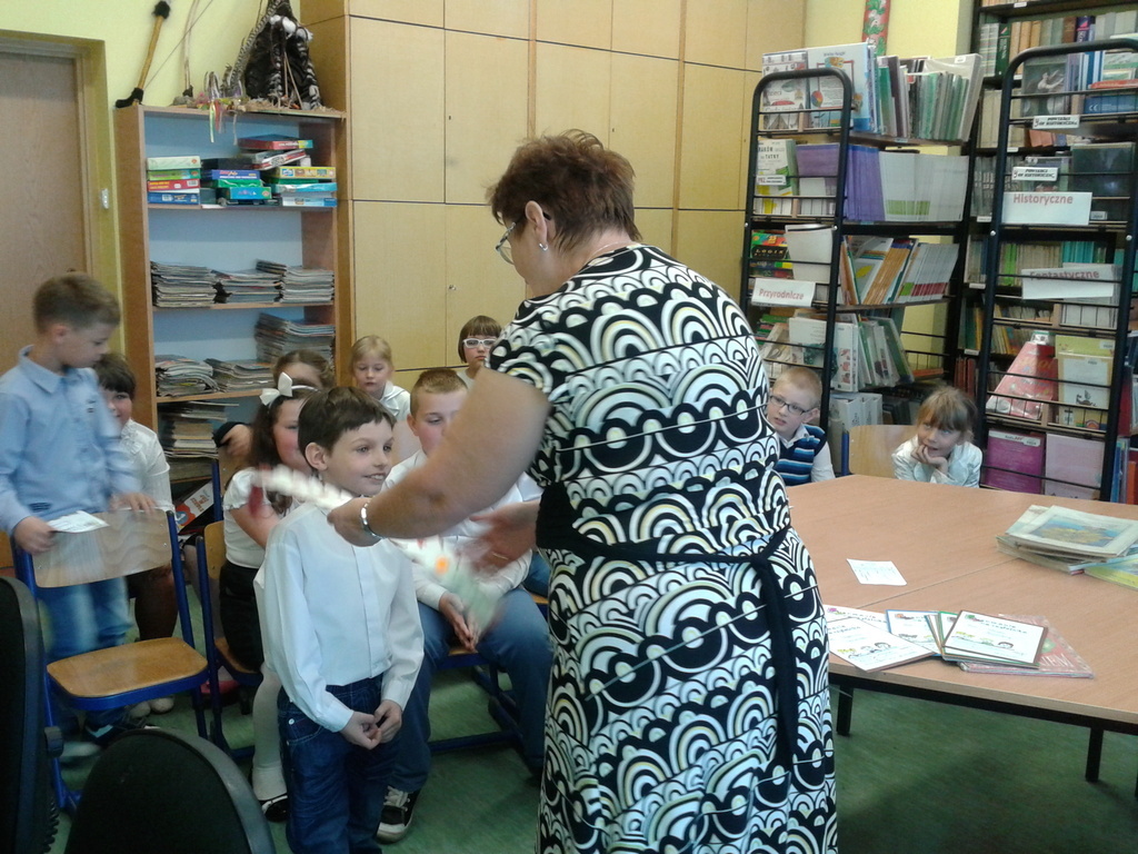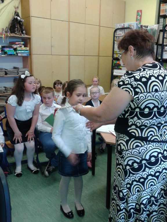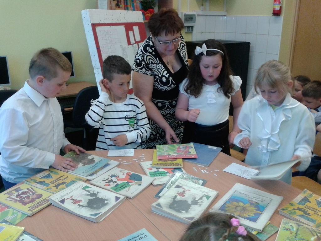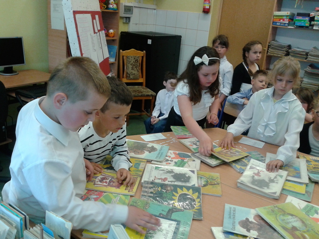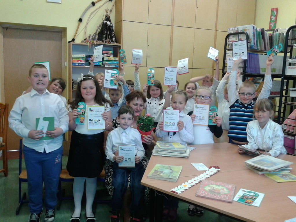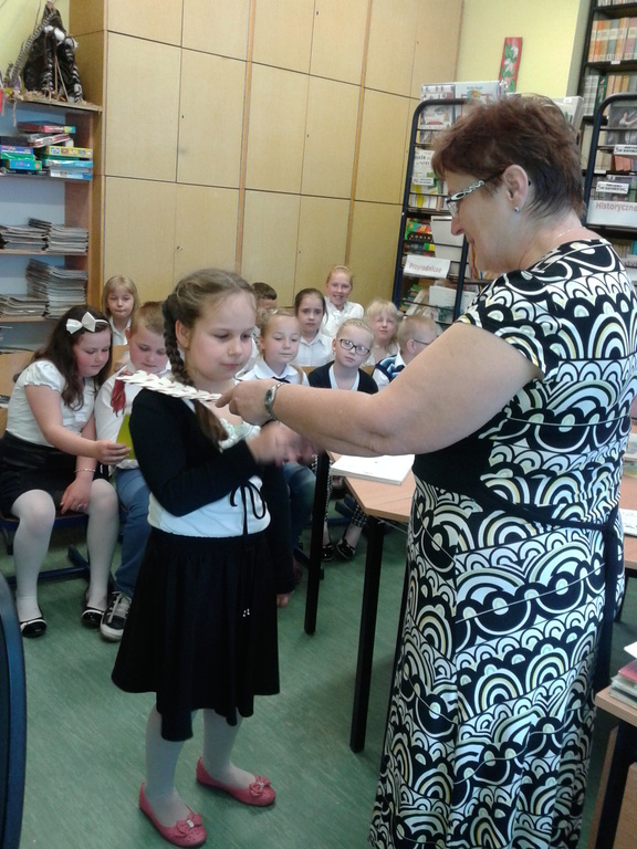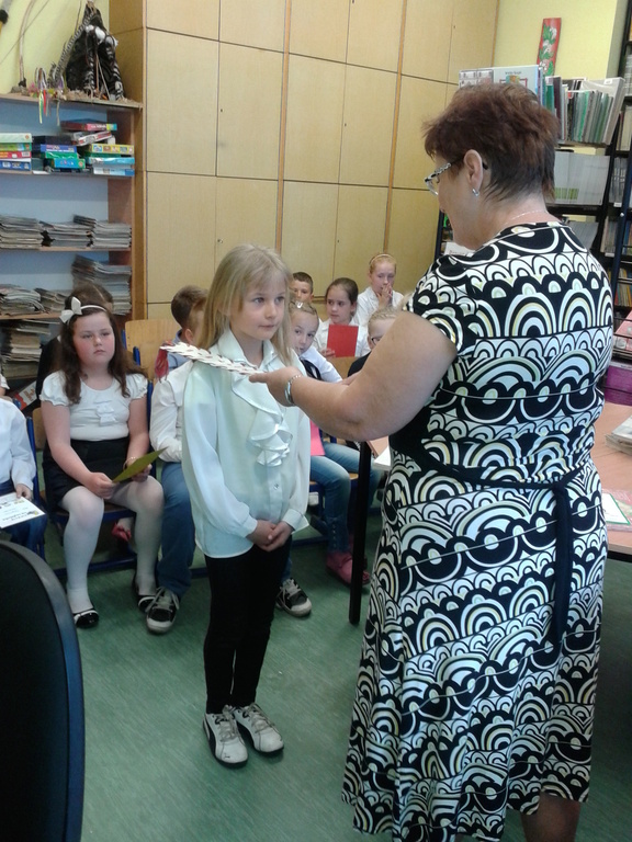 8 maja gośćmi biblioteki szkolnej byli pierwszoklasiści. Przybyli do tego przybytku wiedzy, by zostać pełnoprawnymi czytelnikami. Sprawnie rozwiązując krzyżówki i rebusy udowodnili, że znają już wszystkie litery, potrafią je zapisać, a nawet odczytać dłuższe wyrazy. Zostali więc uroczyście pasowani na czytelnika przez bibliotekarkę panią Jadwigę Rychlicką. Po zapoznaniu się z zasadami korzystania z biblioteki, każdy uczeń po raz pierwszy wypożyczył książkę.